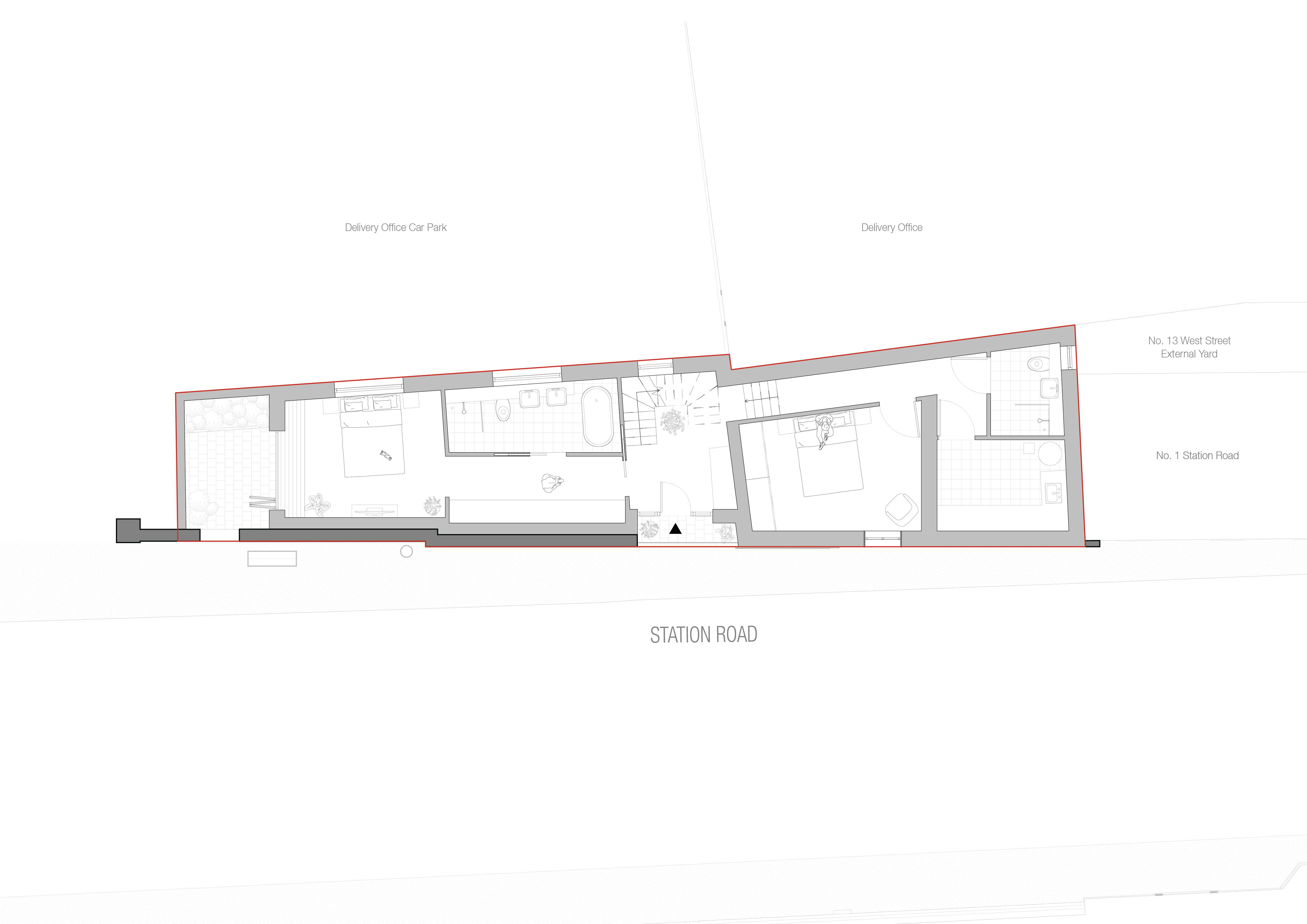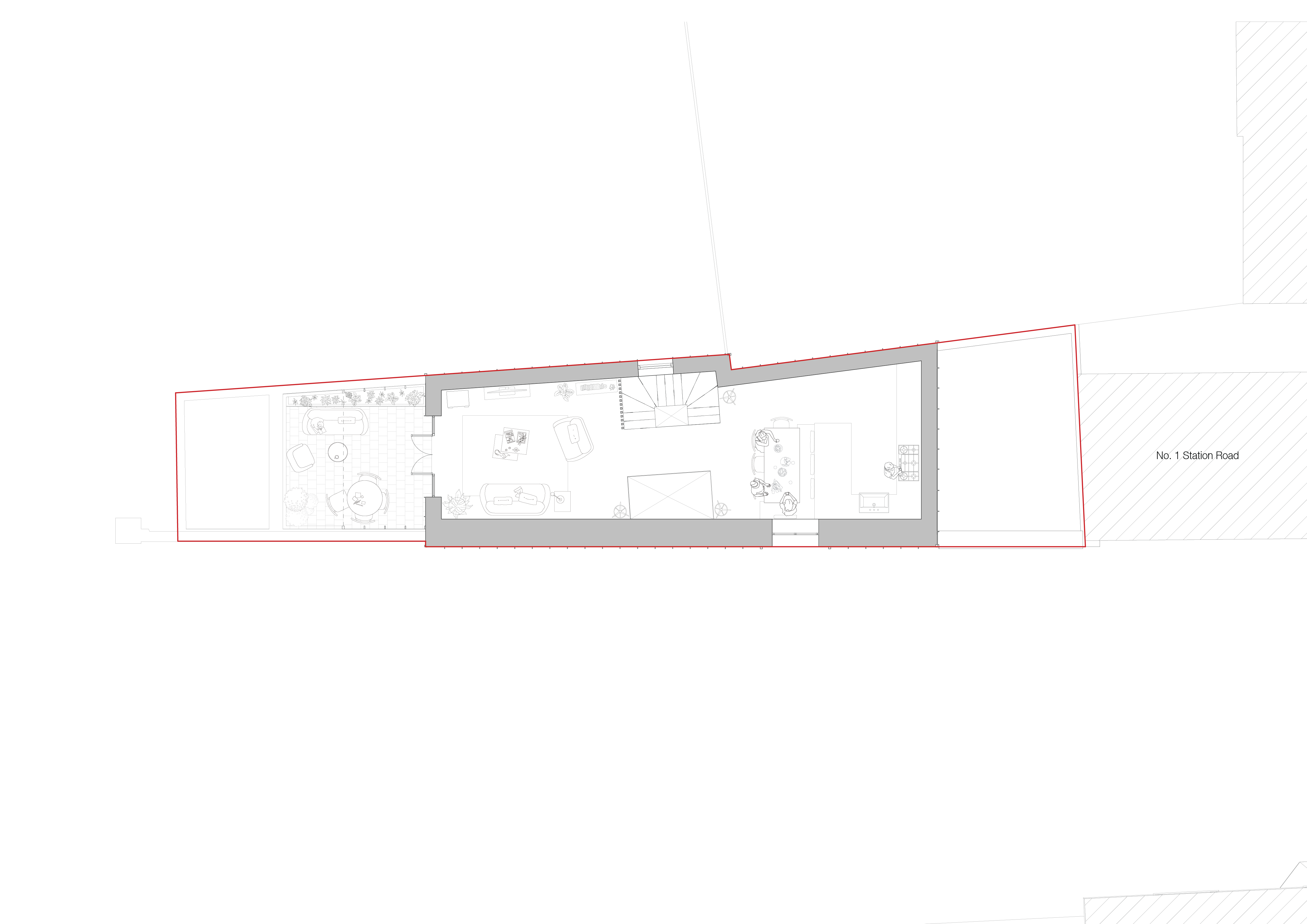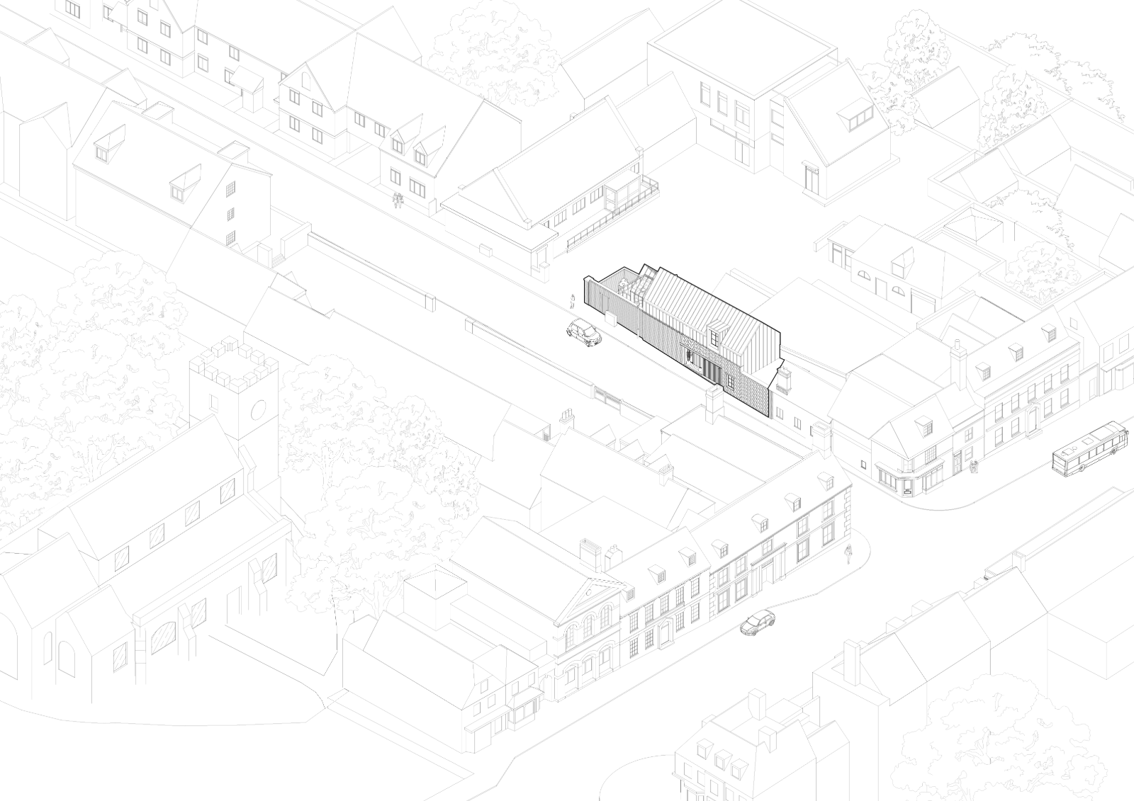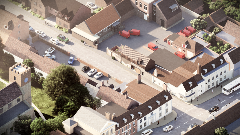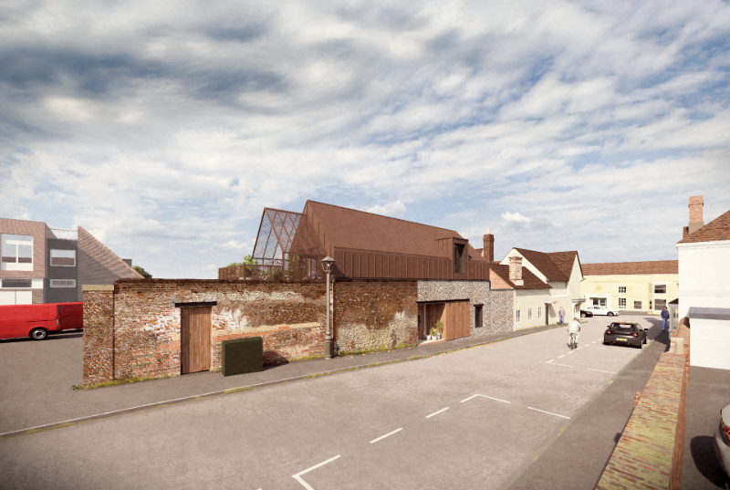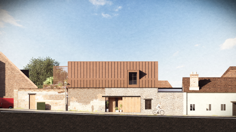 Key elements of the site’s history have been preserved and celebrated. The original boundary wall is being carefully retained and restored, while a new flint wall—traditional to the region—has been introduced to complement the existing fabric. A large, workshop-style timber door has been reinterpreted as a modern feature, offering a contemporary take on the historic entrance. The new standing seam metal roof nods to the original cycle shop’s industrial roofing, blending past and present. The roof terrace features bespoke contemporary solar shading and privacy screening, crafted from perforated metal with a pattern derived from the Alresford crest. This motif has been subtly reinterpreted into a refined design.