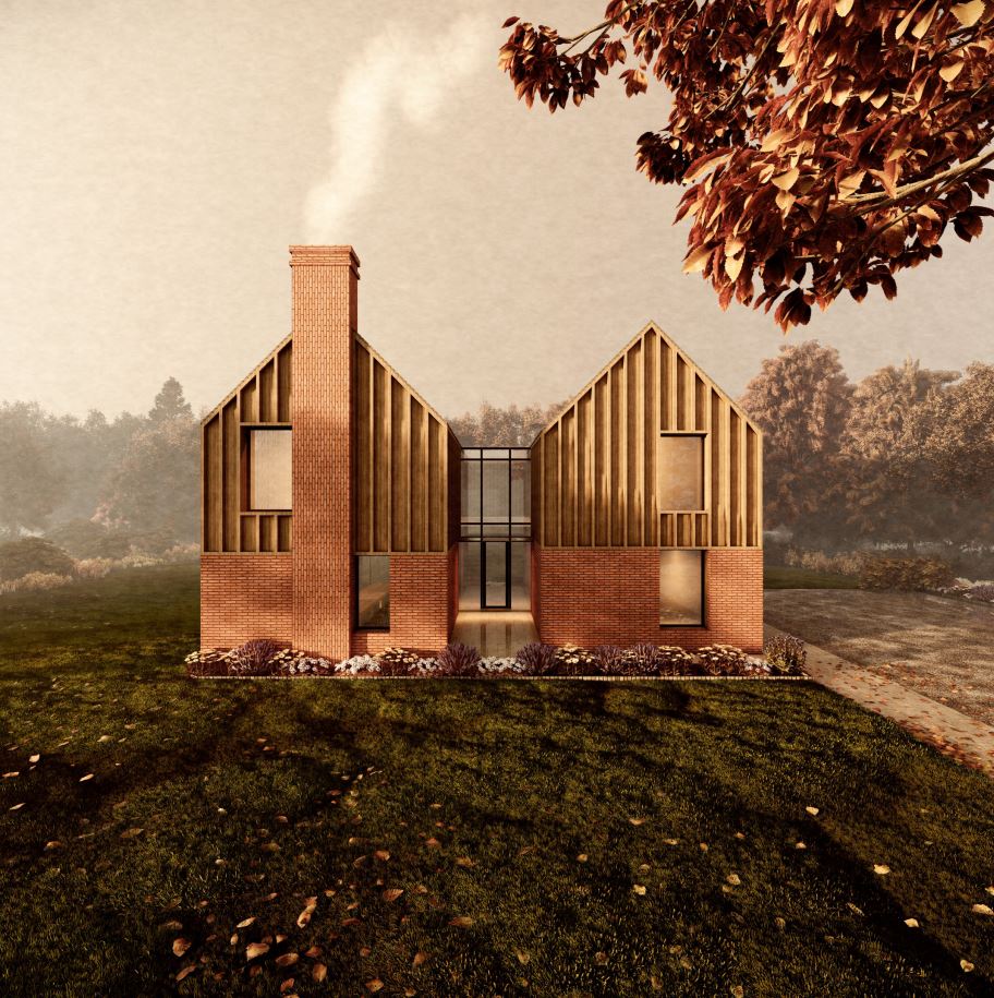 The design takes cues from the rhythm and proportion of nearby Tudor buildings, expressed through a series of articulated gables, exposed timber detailing, and a careful balance of solid and void. Rather than replicate the past, the project seeks to echo its spirit—recasting familiar forms and materials in a modern context. Timber cladding, crisp brickwork, and large glazed openings are combined to create a home that feels both rooted and forward-looking.